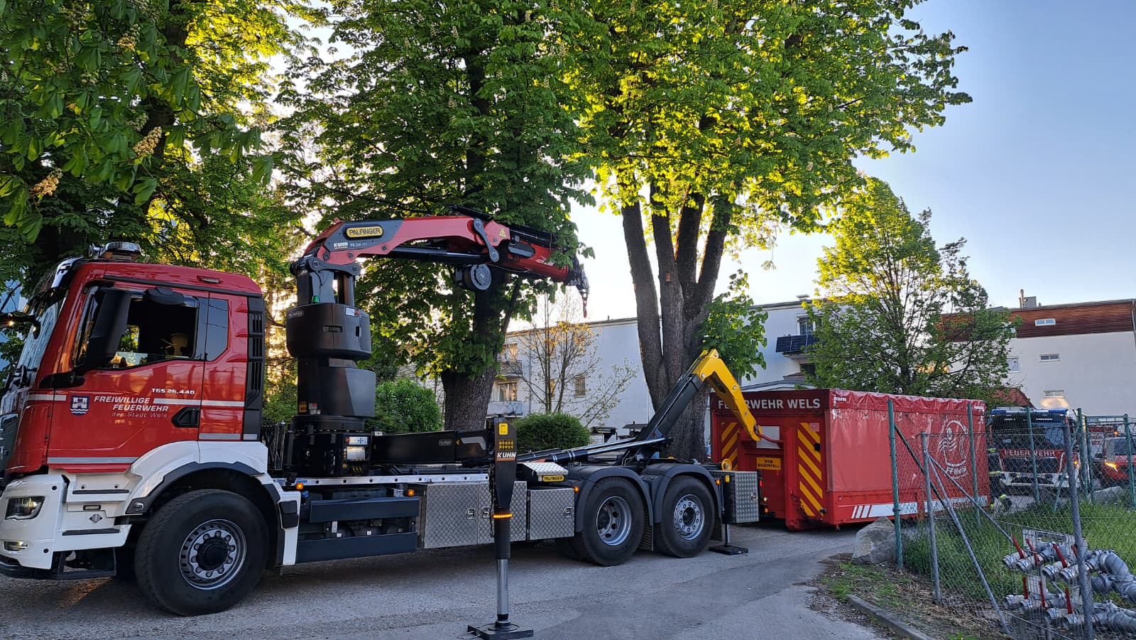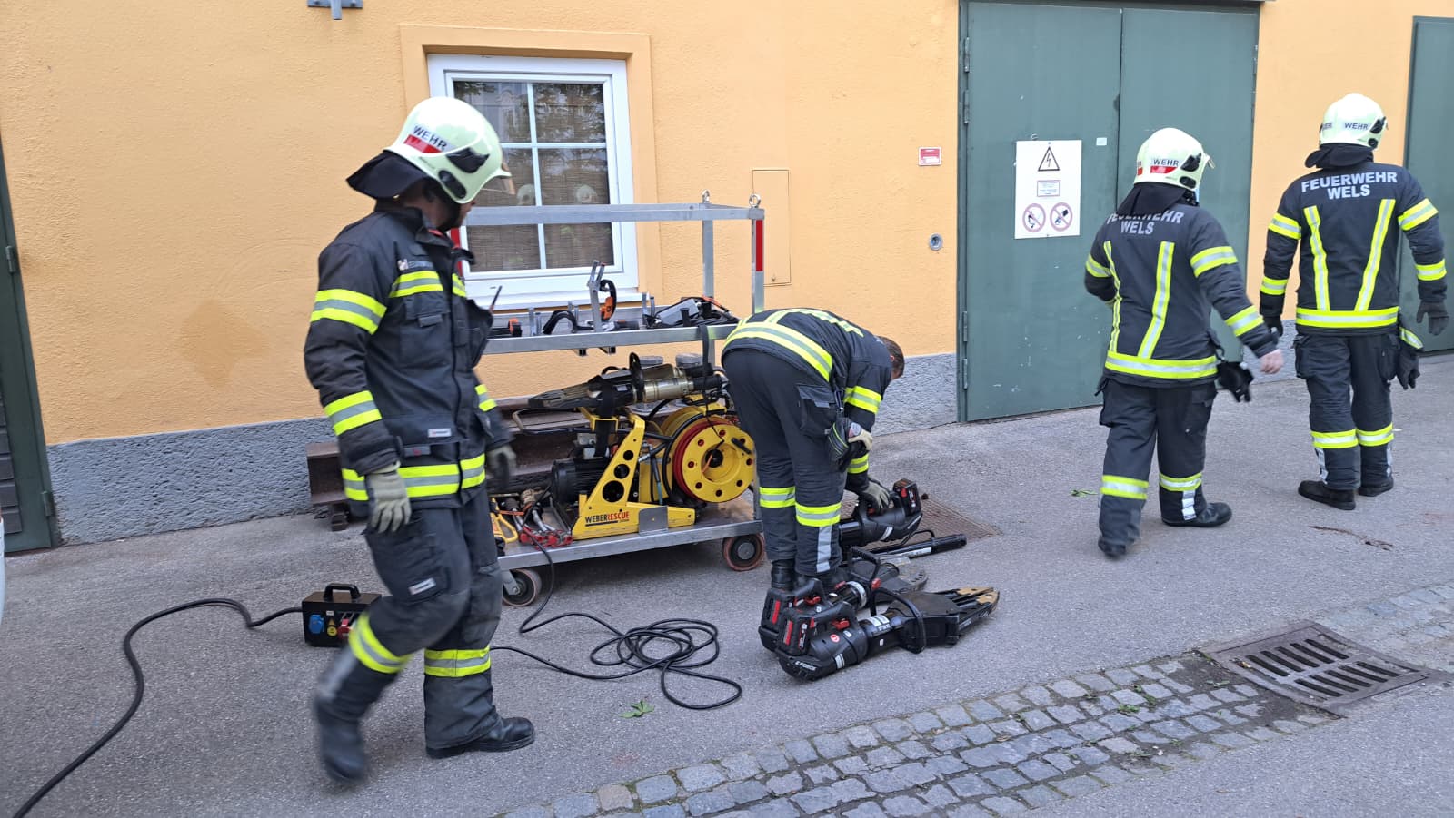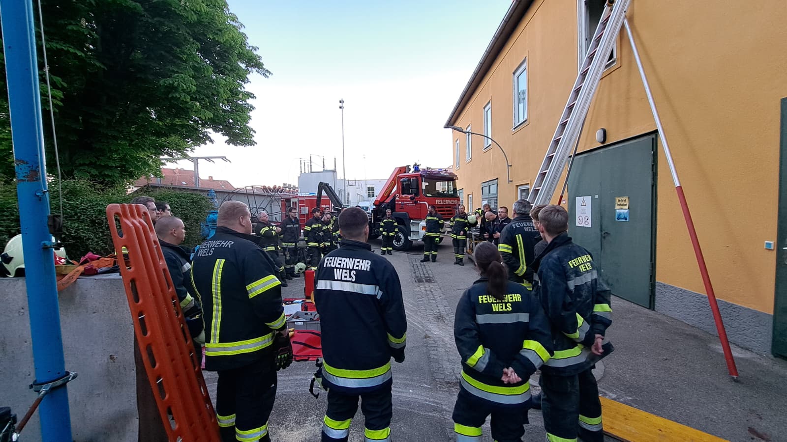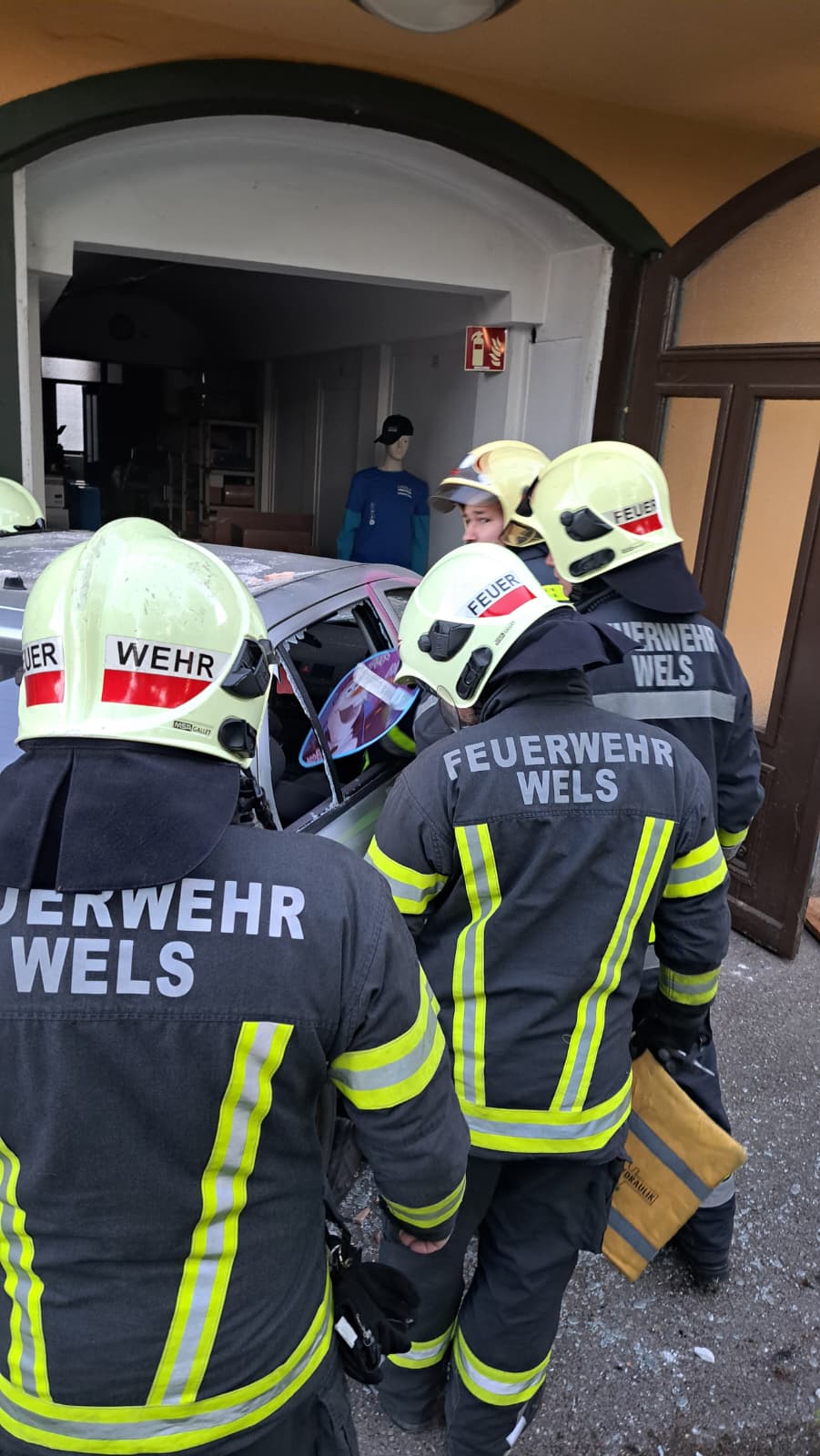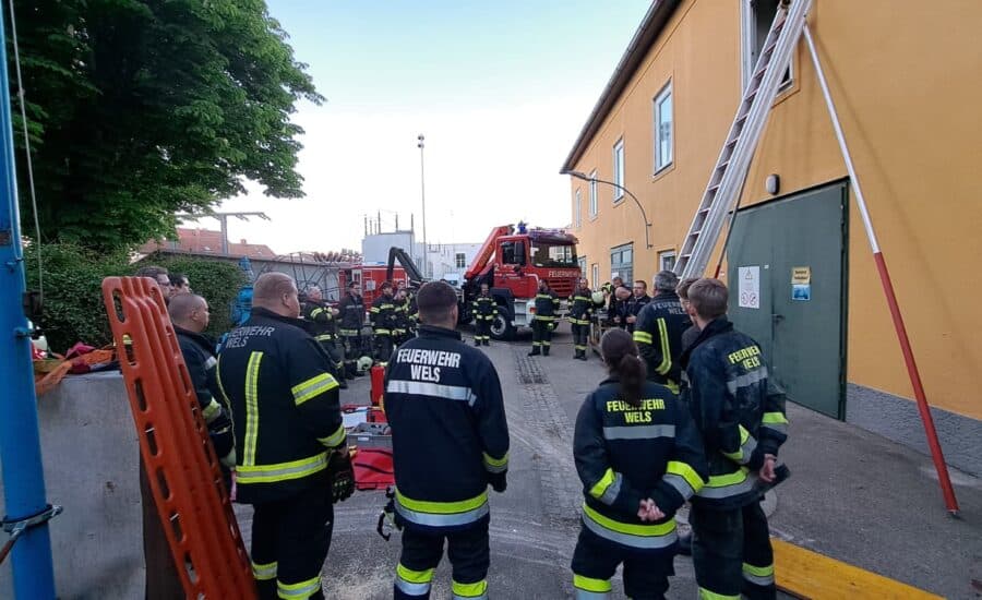 Am 30.04.2026 beübten der 1. Zug und der 3. Zug der Feuerwehr Wels einen fiktiven Verkehrsunfall in Wels Lichtenegg mit einer eingeschlossenen Person im Unfallfahrzeug.