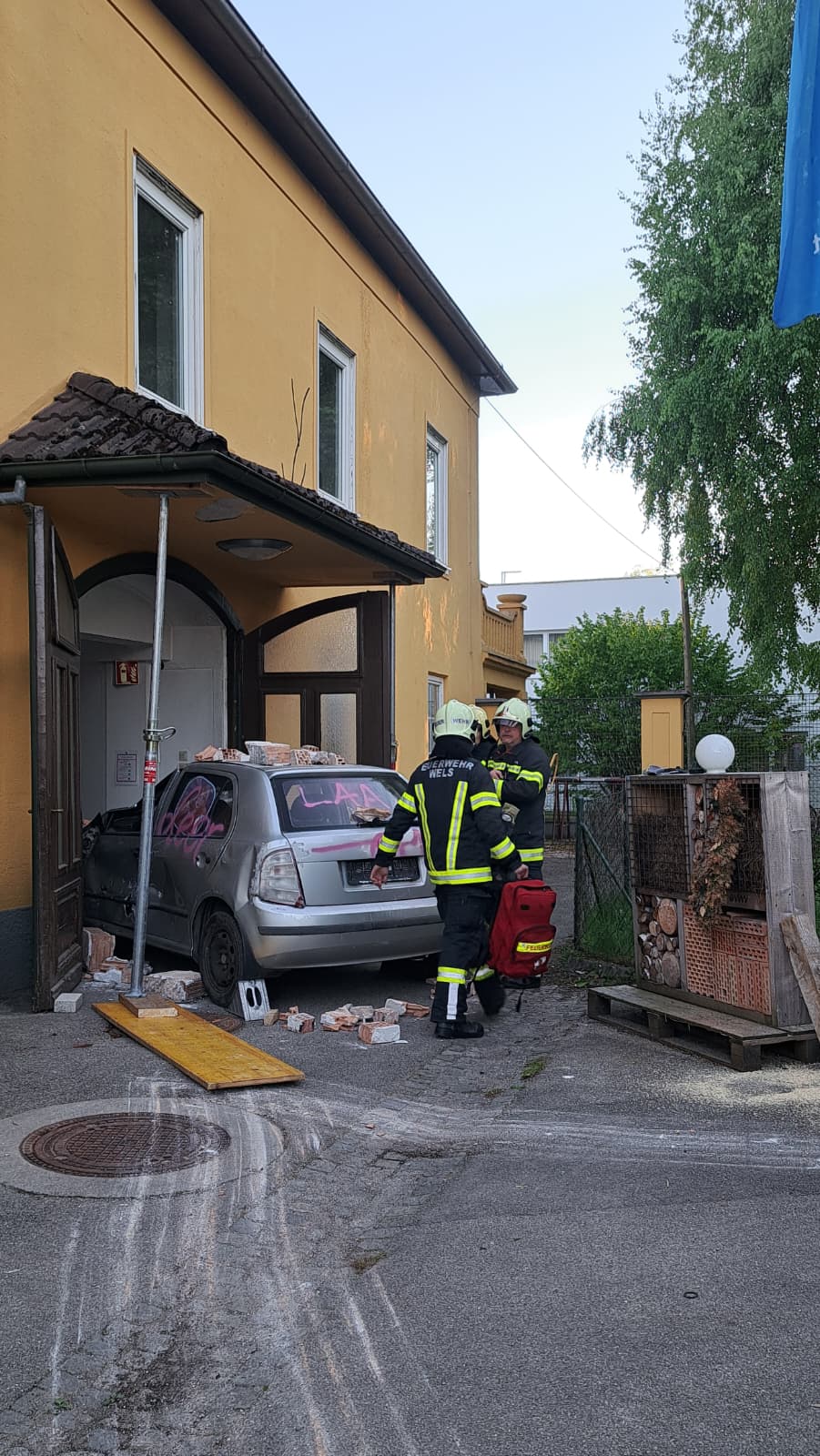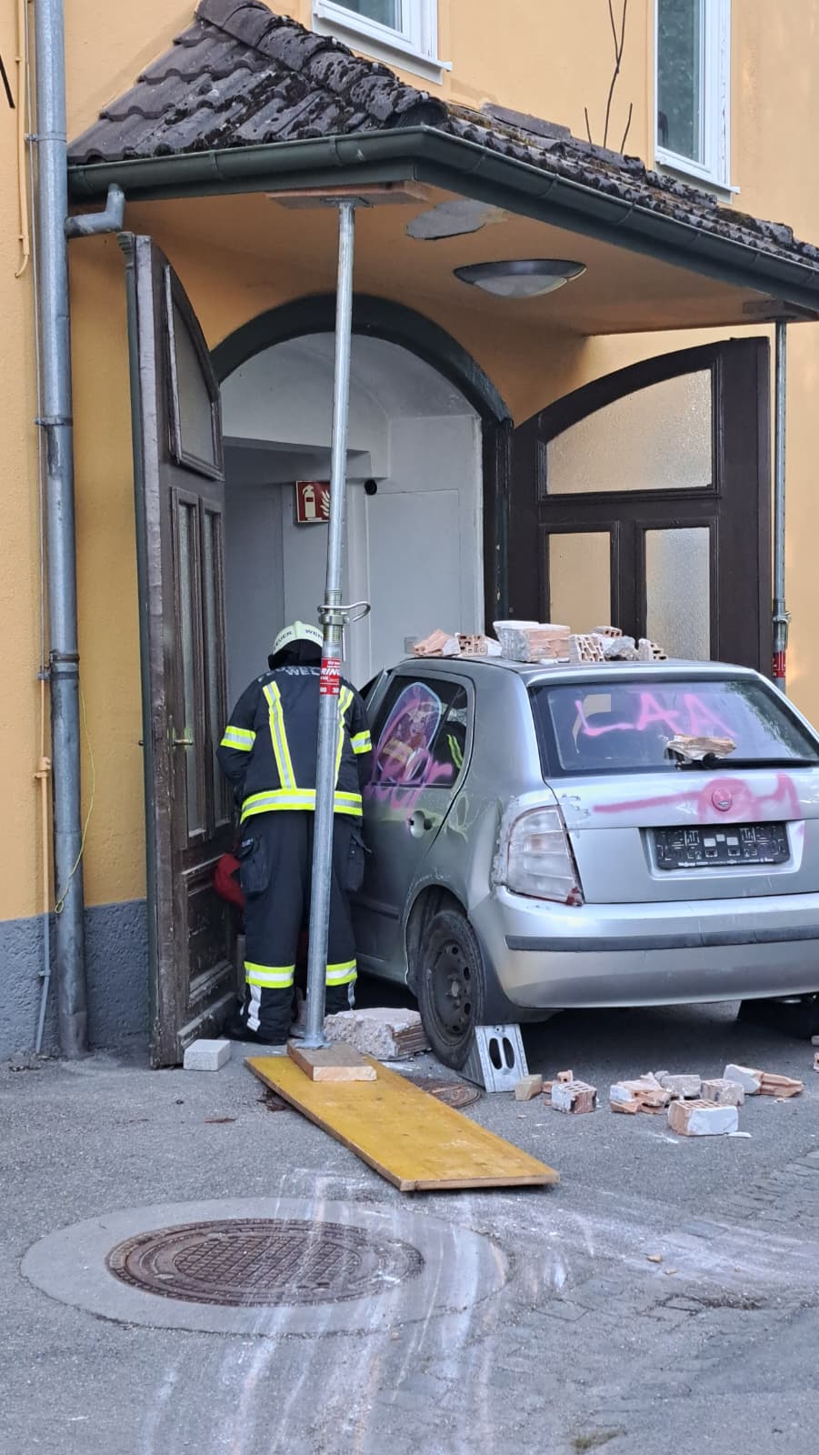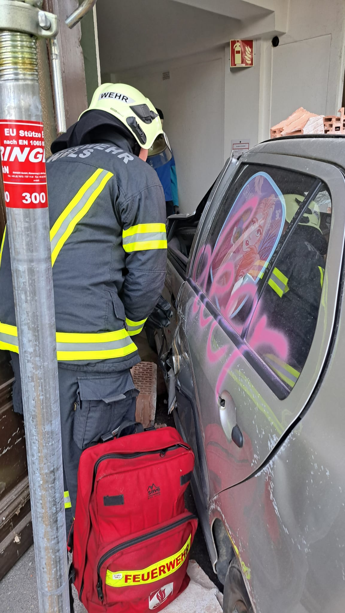 Annahme der Einsatzübung war ein in eine Mauer gekrachtes Fahrzeug mit einer eingeklemmten Person. Das Mauerwerk wurde dabei “beschädigt” und es war mit einem Einsturz des Vordaches zu rechen.