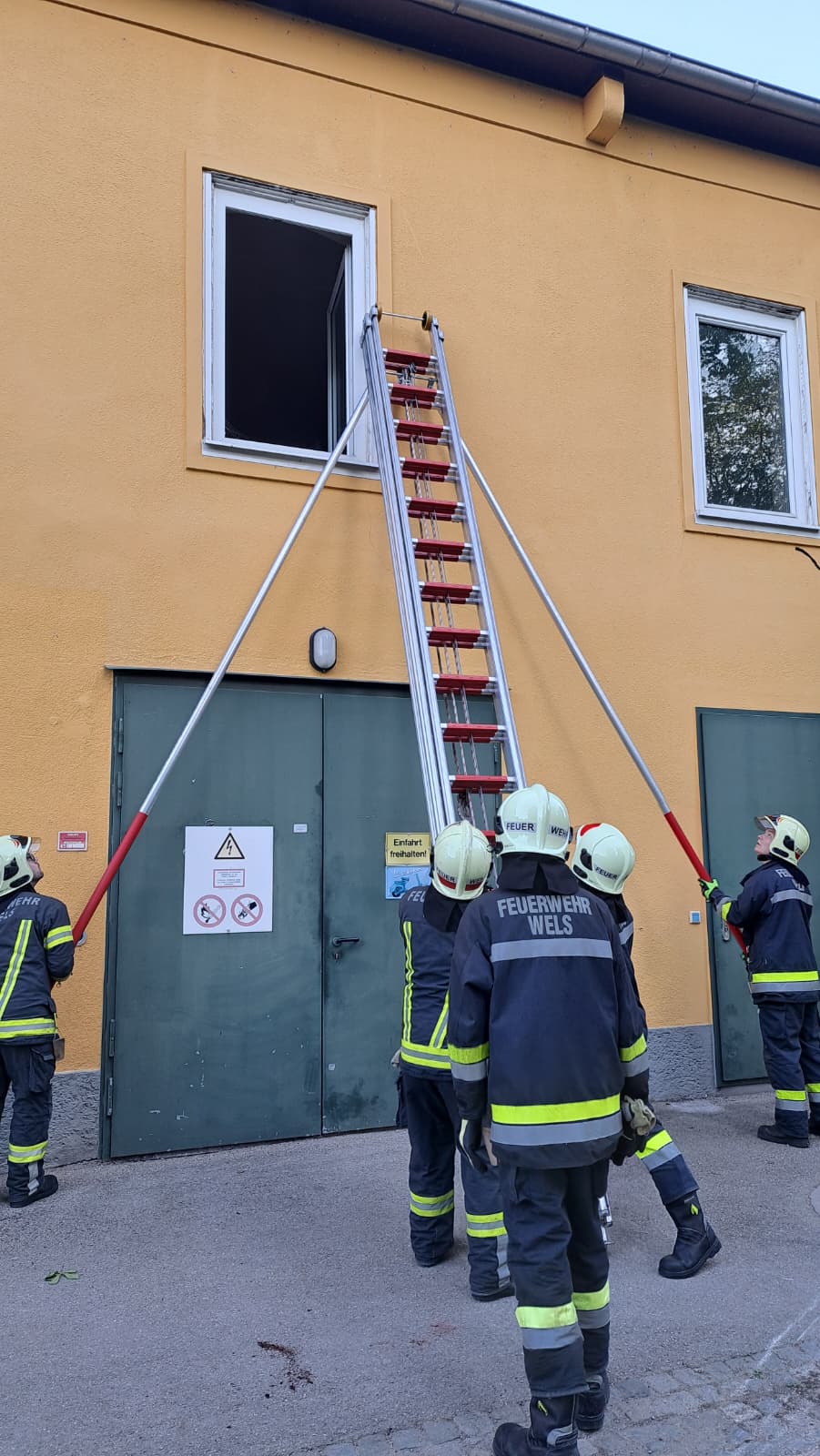 Im Verlauf des Übungseinsatzes machte sich noch eine fiktive Bewohnerin im 1. OG bemerkbar und meldete verrauchte Räumlichkeiten und einen abgeschnittenen Fluchtweg. Ein Atemschutztrupp kontrollierte über die dreiteilige Schiebleiter die Räumlichkeiten.