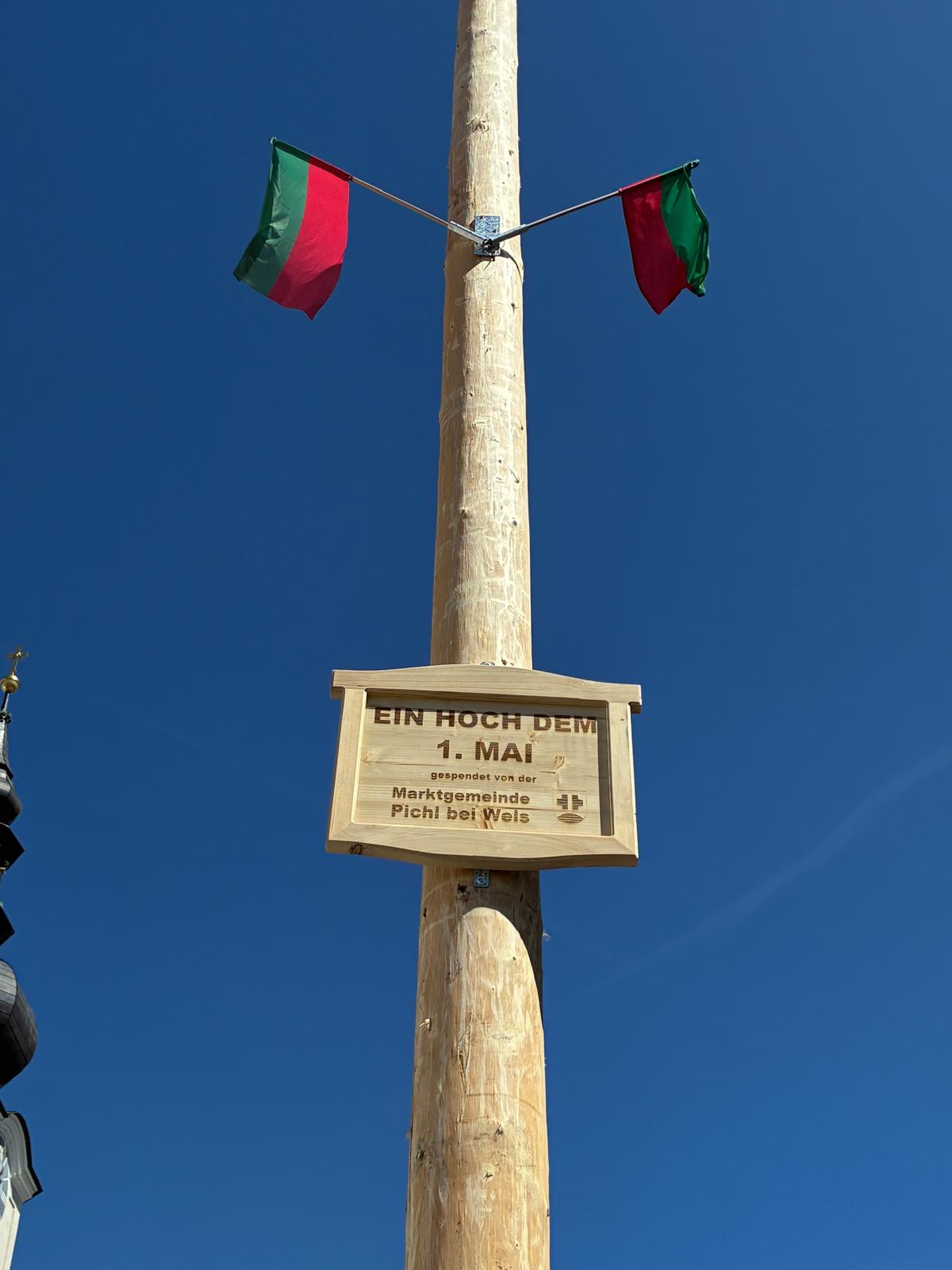 Bei traumhaftem Wetter und bester Stimmung wurde am Samstag, 25.04.2026 der Maibaum am Stadtplatz traditionsgemäß mit reiner Muskelkraft aufgestellt.
