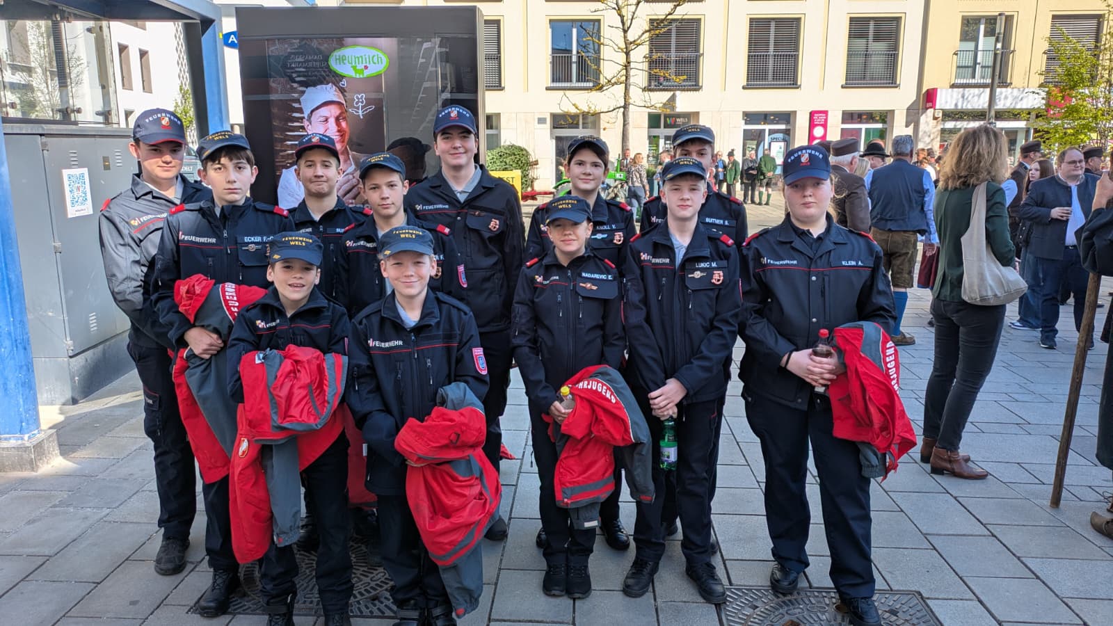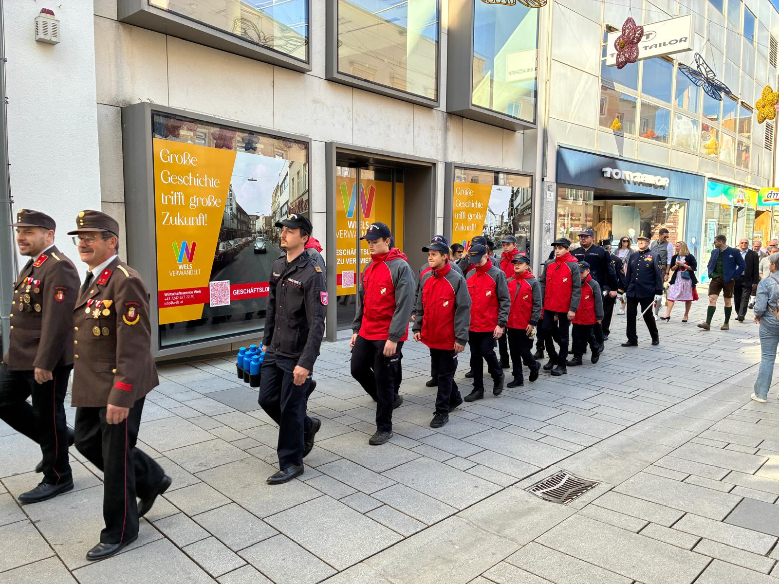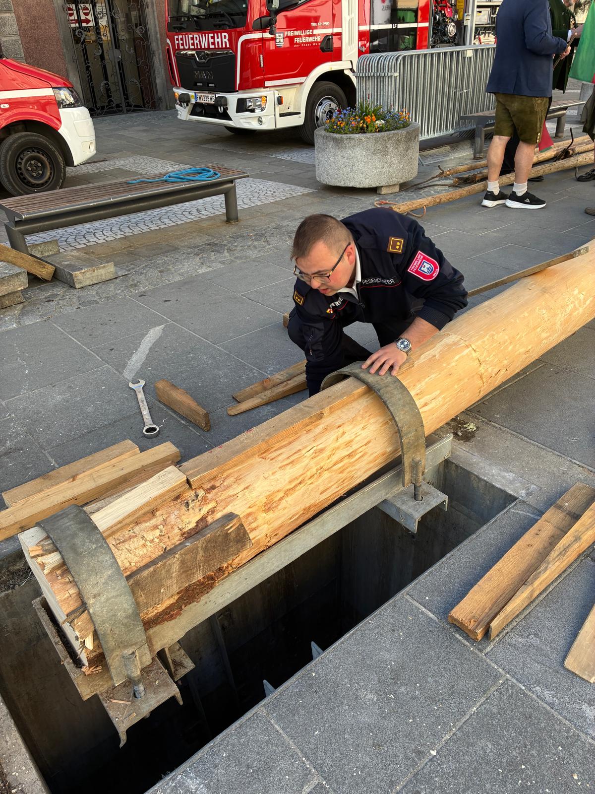 Unsere Feuerwehrjugend marschierte beim Einzug mit und aktive Kameraden halfen, den 27 Meter hohen Baum gemeinsam mit der Feuerwehr Pichl bei Wels, der Feuerwehr Geisensheim, der Feuerwehr Sulzbach und der Landjugend Pichl bei Wels aufzustellen und sicher zu verankern.